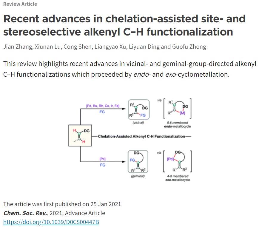 近日, 亚洲色吧 材化学院的张坚教授与钟国富教授,凭借课题组近五年来在配位导向下烯烃惰性碳氢键的选择性活化/官能团化研究领域的出色工作,受邀总结了本课题组和国内外同行们在该领域中同碳位和邻碳位碳氢键官能团化反应,包括:烯基化、烯丙基化、烷基化、芳基化、卤化、以及多米诺环化等,并对各种方法的优缺点进行归纳和总结,最后对该领域的发展和应用进行展望。该成果近日以题为“Recent advances in chelation-assisted site- and stereoselective alkenyl C–H functionalization”,在英国皇家化学学会顶级综述期刊Chemical Society Reviews(IF: 42.846)上发表(Chem. Soc. Rev., 2021, DOI: org/10.1039/D0CS00447B, Advance Article)。张坚教授和钟国富教授为该文章的共同通讯作者。