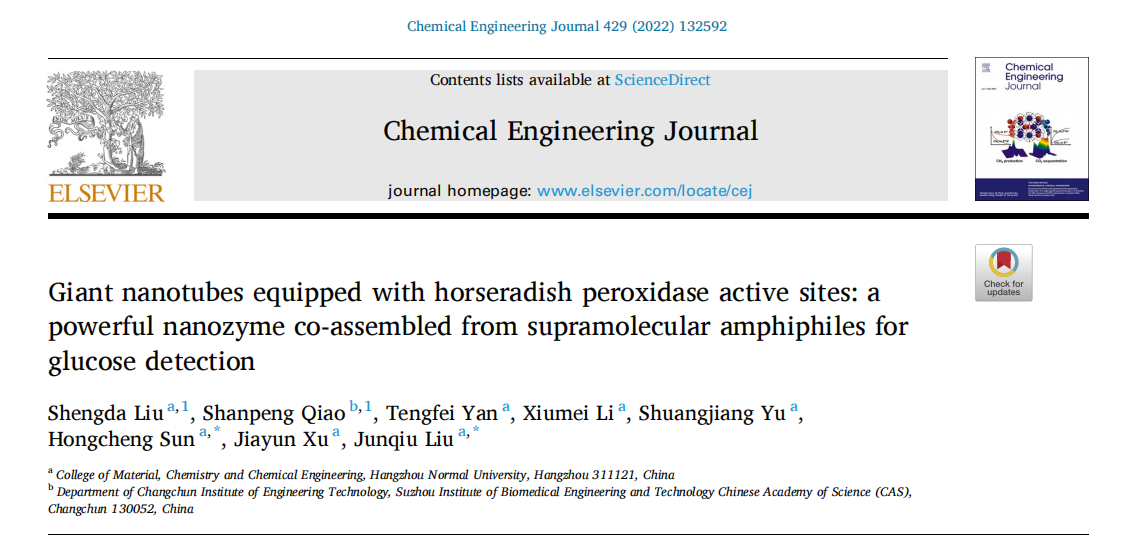 近日,亚洲色吧 刘俊秋教授团队开展的基于超分子双亲物共组装方式构建高效纳米酶材料取得新进展。相关研究结果以“Giant nanotubes equipped with horseradish peroxidase active sites: a powerful nanozyme co-assembled from supramolecular amphiphiles for glucose detection”为题发表在《Chemical Engineering Journal》(2022, 429, 132529; IF: 13.273)。