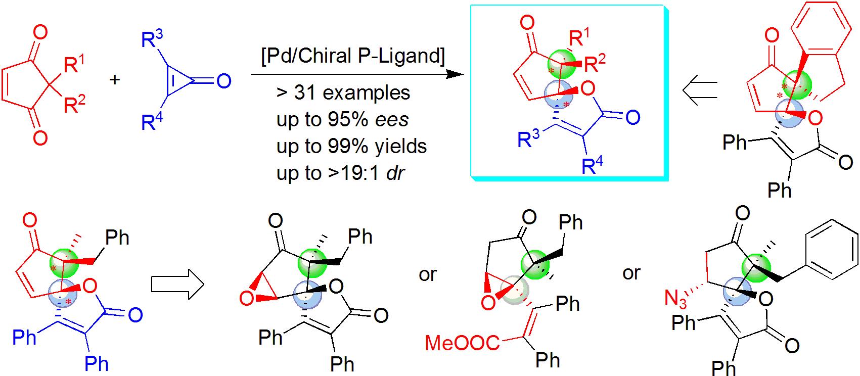鉴于C-C键活化和手性配体在构建四取代立体手性中心上有着巨大的潜力,亚洲色吧 徐利文课题组在前期不对称催化化学的研究基础(见该团队近期研究专题报道,Acc. Chem. Res. 2021, 54, 452-470)上,利用钯金属和TADDOL衍生的大位阻膦配体,首次高效、高对映选择性、高非对映选择性催化环丙烯酮和环戊烯-1,3-二酮进行(3+2)螺环化反应。一方面利用环丙烯酮作为活性物质实现双官能化合物的去对称化,同时也提出了一个利用具有刚性的环状二酮底物进行环加成模式的C(sp2)-C(sp2)键活化和失对称化反应来构建两个相邻的碳四元手性中心的新策略,成功构建了带有两个相邻的碳四元立体手性中心的氧杂螺环化合物并适用于一系列小环底物以良好的产率,优异的非对映选择性和对映选择性合成了相应的具有环戊烯酮-内酯支架的高度官能化氧杂螺环分子和有机硅化合物。上述发现为进一步探索C-C键活化及其对映选择性构建复杂有机分子提供了新的途径。