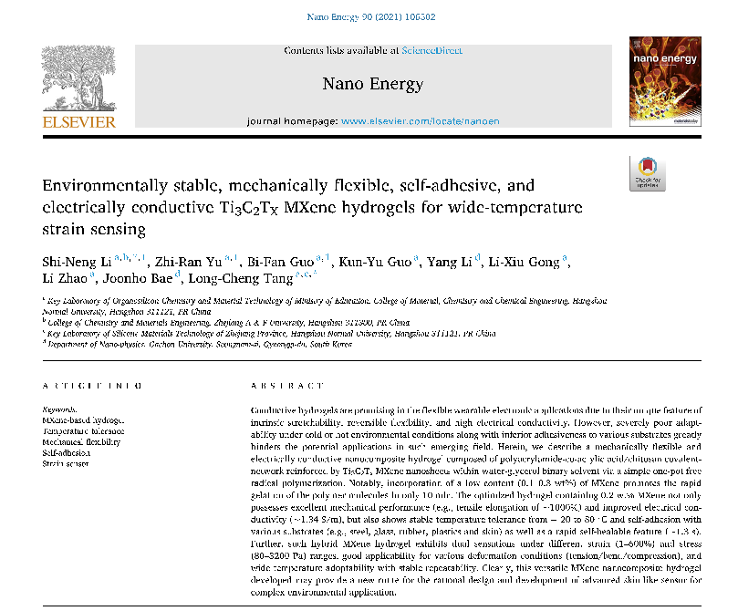 近日,亚洲色吧 汤龙程研究员团队及其合作者浙江农林大学厉世能博士在国际知名期刊Nano Energy上发表题为“Environmentally stable, mechanically flexible, self-adhesive, and electrically conductive Ti3C2Tx MXene hydrogels for wide-temperature strain sensing”的文章(2021, 90, 106502;IF=17.881)。