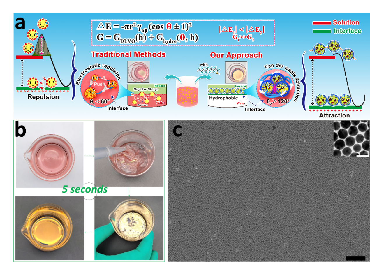遗憾的是,由于难以克服的动力学和热力学吸附势垒,传统液-液界面自组装往往呈现耗时、重复性差、无法大面积制备、粒子组装可控性差、组装效率低等不足,并导致纳米粒子界面自组装尚未用于纳米薄膜工程化技术开发,进而限制其在传感、显示、光电器件等领域的功能应用。
