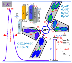 有机电致发光器件(OLED)具有轻薄、低功耗、高对比度、自发光以及可柔性等优势,在显示与照明应用领域中大放光彩。近紫外有机发光二极管(NUV-OLED)在化学和生物传感器、光激发源、固态显示器和高密度信息存储设备等领域的广泛应用前景使之成为热点前沿领域。从材料设计角度,开发兼具高固态发光效率和高激子利用率的有机发光材料,是构筑高性能OLED的关键。但根据自旋统计规则有机电致发光器件中载流子复合仅会以25%概率形成可以辐射发光的单线态,而75%的三线态激子会被浪费。具有杂化局域电荷转移态(HLCT)的分子能够利用高能级三线态激子反向系间窜越生成单线态激子,理论上可现实100%的激子利用。但HLCT分子中电荷转移态常使光谱红移,因此如何平衡发光波长和高激子利用率是近紫外发光材料设计的难点。
