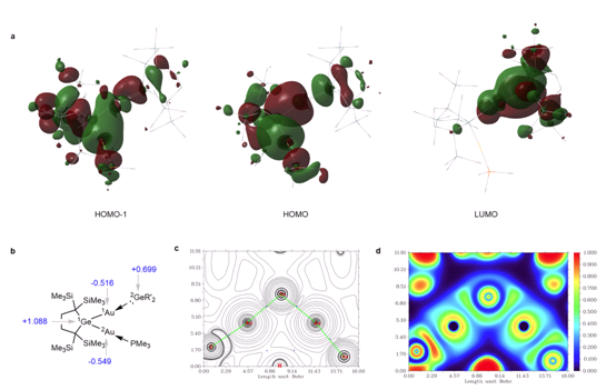 研究者基于锗基一价金与碱金属的还原反应,构筑中锗原子桥连的双核负一价化合物;其中两个金原子可以看成类卤素。并通过理论计算系统研究了该化合物的成键特质:其中两个Ge‒Au键具有显著的σ特性;其最低非成键轨道保持二烷基锗烯的固有特征为其空的pπ轨道。该双金化合物也表现出在不同位点的新奇双亲性:在与亲核试剂反应时,体现锗烯配体空的p轨道的反应特性;在与亲电试剂的反应中也体现出富电子金原子中心的反应特性。在芳基异氰酸酯的三聚反应中,双金化合物也展现出极高的催化活性,展现该类双亲化合物在催化领域的应用与发展的前景。
