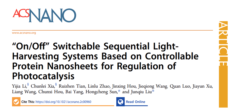 近日, 亚洲色吧 刘俊秋教授团队在可控蛋白质自组装结构的多级人工光捕获系统开关方面取得新进展,相关研究工作在国际期刊ACS NANO(IF:15.881)发表学术论文“On/Off Switchable Sequential Light-Harvesting Systems Based on Controllable Protein Nanosheets for Regulation of Photocatalysis”。