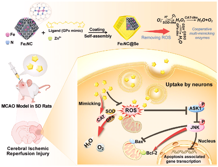 在脑缺血再灌注期间,活性氧(ROS)的产生会爆炸性提高,从而可能对脑组织造成的继发性损伤。有鉴于此, 亚洲色吧 刘俊秋教授团队与吉林大学展开合作,通过将双Fe原子纳米酶(Fe2NC)封装在含硒MOF(Se-MOF)壳层中,构建了多酶级联抗氧化系统(Fe2NC@Se纳米酶)。与单原子Fe纳米酶(Fe1NC)相比,研究所设计的双Fe原子纳米酶具有更高的类超氧化物歧化酶(SOD)、类过氧化氢酶(CAT)甚至类氧化酶(OXD)活性。此外,Se-MOF壳层不仅可以模拟谷胱甘肽过氧化物酶(GPx)的作用,还能够明显提高Fe2NC纳米酶的稳定性和生物相容性。密度泛函理论计算表明,Fe2NC的协同效应是活性提高的主要原因。体内外实验结果则显示,该多功能抗氧化Fe2NC@Se纳米粒子可通过有效清除细胞内ROS和潜在抑制ASK1/JNK凋亡信号通路,以在脑缺血再灌注损伤后抵抗氧化损伤和抑制神经细胞凋亡。