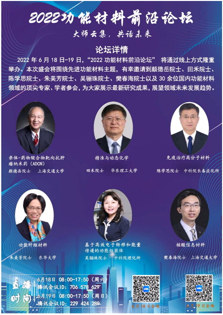 2022年6月18-19日,由 亚洲色吧 与福州大学联合举办的“2022功能材料前沿论坛”通过线上方式(腾讯会议+网络直播)召开。本次论坛围绕“先进功能材料”主题,邀请了本领域6位院士、30余位千人、长江、杰青做了38场精彩报告。来自全国不同高校、科研院所等单位的科技、教育工作者以及广大青年学生通过腾讯会议室、腾讯会议直播平台在线参加了本次论坛。