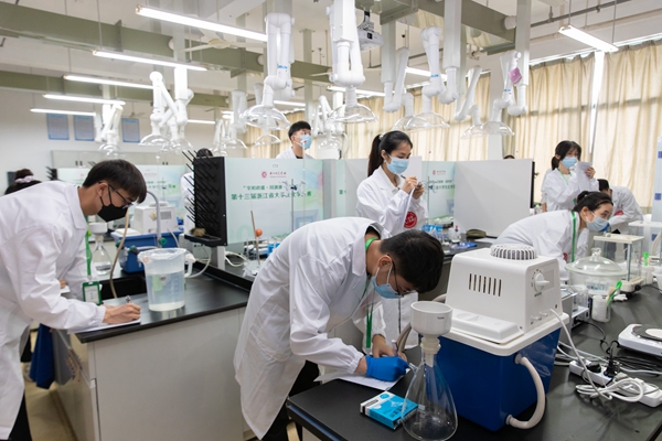 本届大学生化学竞赛的主题为“绿色化学,智创未来”,由浙江省教育厅指导,浙江省大学生科技竞赛委员会、浙江省高等学校化学类与化工制药类专业教学指导委员会、浙江省大学化学课程教学指导委员会和浙江省化学会共同主办,湖州师范学院和浙江工业大学共同承办。来自省内37所高校单位、共542支参赛队伍报名参赛,亚洲色吧 在38支报名队伍中经过筛选,派出20支队伍入围,围绕“‘以废治废,绿色化学’——基于聚氨酯塑料的多孔材料制备及对油水分离的应用研究”的课题开展创新项目的研究,提交了创新研究课题作品;随后,开展了“双盲式”网络初评工作,筛选出了来自30所高校的91支队伍进入湖州师范学院参加决赛。决赛阶段包括“化学知识测试”“研究项目答辩”和“实践能力考核”三个方面,其中答辩环节采取线上和线下相结合方式进行,对参赛学生的化学知识、化学实践能力、创新能力进行全面考察。最终,来自全省各高校的共32支队伍获一等奖,59支队伍获二等奖,88支队伍获三等奖。