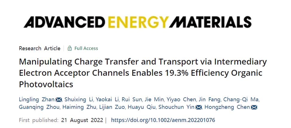 近日, 亚洲色吧 邱化玉团队在有机光伏器件效率突破方面取得最新进展,相关研究发表于著名国际期刊Advanced Energy Martials(IF = 29.698),论文题目为“Manipulating Charge Transfer and Transport via Intermediary Electron Acceptor Channels Enables 19.3% Efficiency Organic Photovoltaics”。