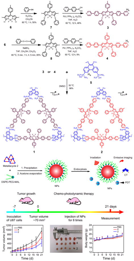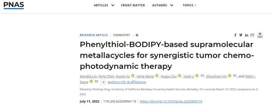 邱化玉团队和美国犹他大学Peter J. Stang教授课题组在功能性超分子金属环协同应用于肿瘤化疗和光动力治疗方面取得最新进展,相关研究发表于著名国际期刊PROCEEDINGS OF THE NATIONAL ACADEMY OF SCIENCES OF THE UNITED STATES OF AMERICA(IF = 12.779),论文题目为“Phenylthiol-BODIPY-based supramolecular metallacycles for synergistic tumor chemo-photodynamic therapy”。