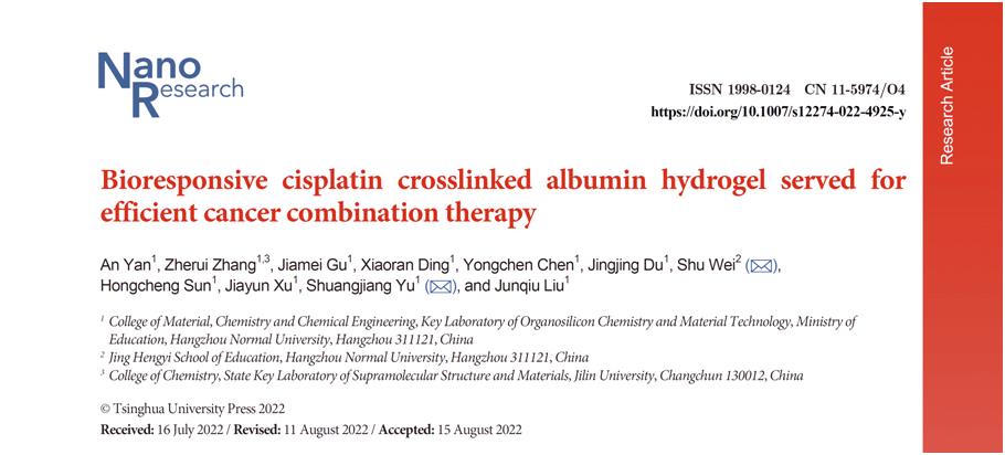 近日,亚洲色吧 刘俊秋教授团队在载药凝胶肿瘤局部联合治疗研究方面取得新进展。相关研究结果以“Bioresponsive cisplatin crosslinked albumin hydrogel served for efficient cancer combination therapy”为题发表在Nano Research (IF: 10.269)。