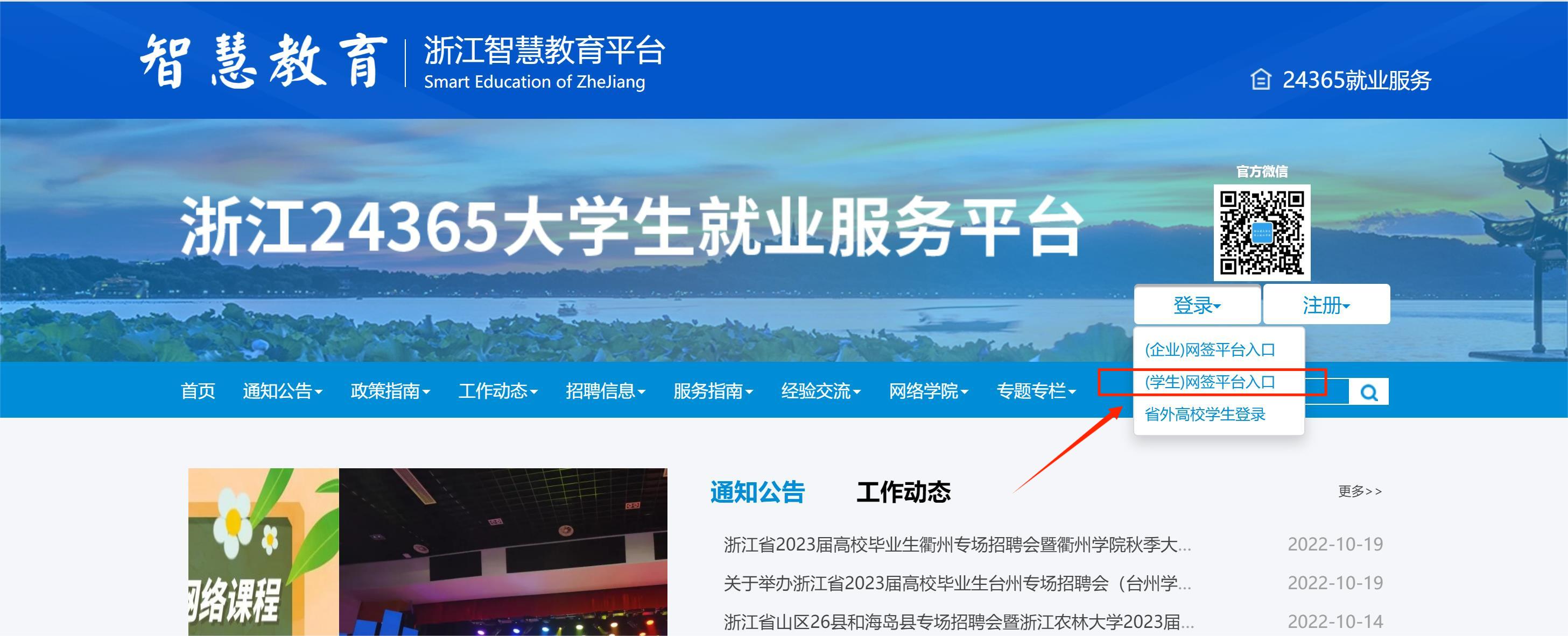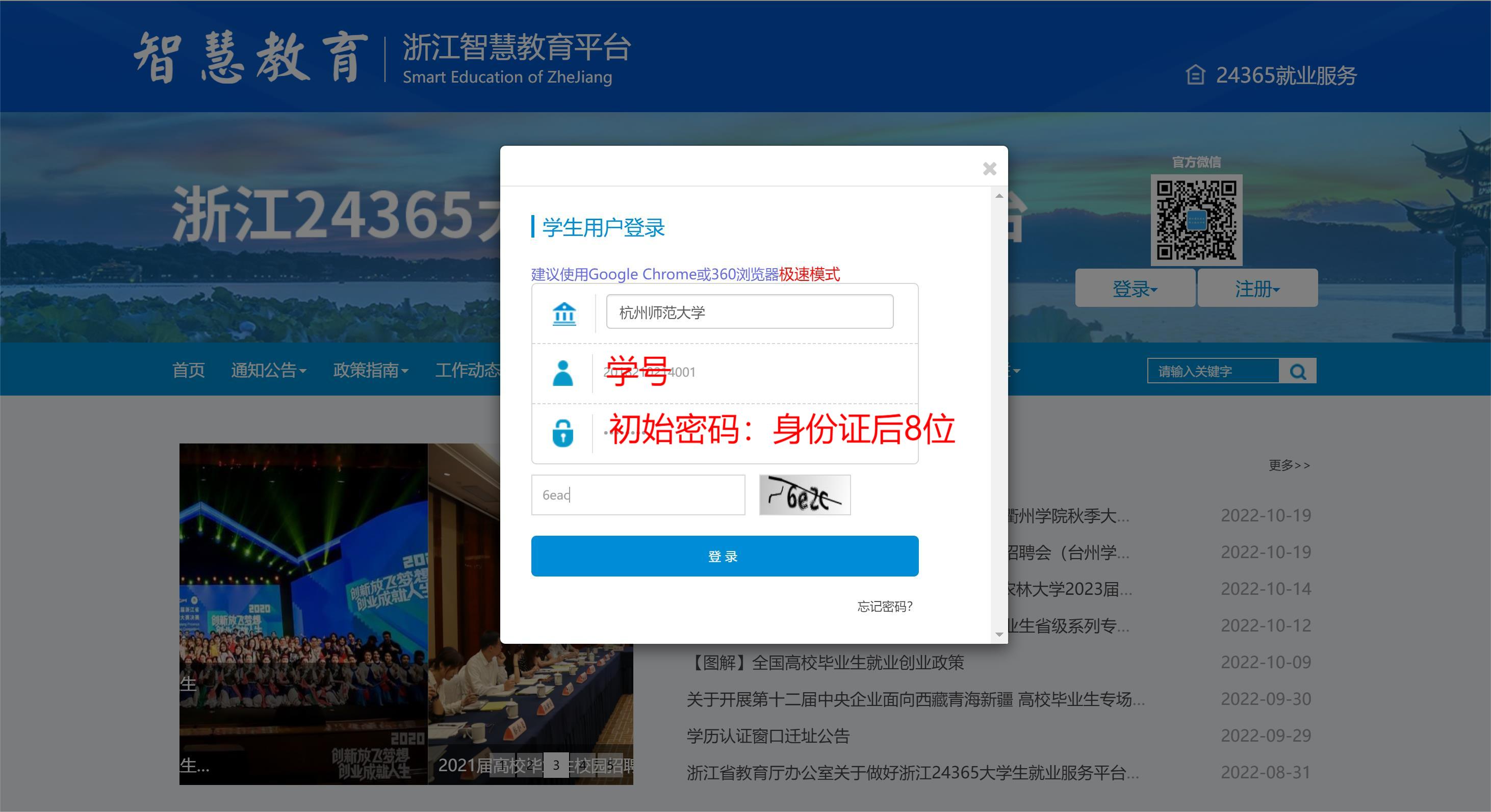 1. 登录“浙江24365大学生就业服务平台”(//www.ejobmart.cn),选择“登录”“(学生)网签平台入口”,选择学校 亚洲色吧 ,初始登录名为学号,登录密码为身份证后8位。