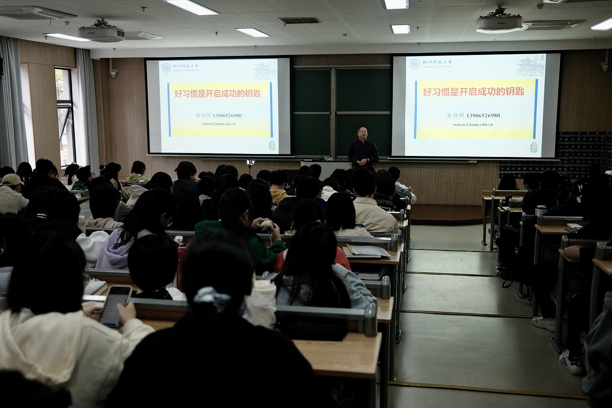 徐伟明教授以“好习惯是开启成功的钥匙”为题,从“什么是化学”、“什么是真正的大学”切入,以阿里云创始人王坚在创业路上艰苦奋斗的事迹为例,呼吁同学们保持良好的心态,相信所坚持的,坚持所相信的,以乐观的态度面对未来道路上的一切困难。徐老师指出,“凡事预则立,不预则废”,一个成功的大学生,应该清晰地认识到自己的奋斗目标,并为之制定缜密的规划,这样才能风雨兼程、义无反顾,同时勉励在座的同学应怀有梦想精神,大胆树立理想,并为之不断奋斗。