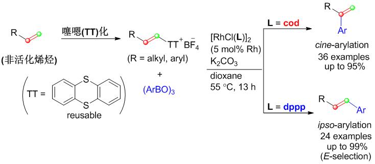 作者(黄银华)在前期对手性双烯配体的研究(J. Am. Chem. Soc. 2014, 136, 4865-4868;J. Am. Chem. Soc. 2015, 137, 7556-7559;J. Am. Chem. Soc. 2016, 138, 12340-12343;Chem. Rev. 2022, 122, 14346-14404)工作中发现,双烯配体和膦配体在某些催化反应中对反应活性、选择性(区域选择性、立体选择性(顺反,E/Z异构)、对映选择性等)的控制表现出截然不同的性质,有时又可起互补作用。基于上述发现,作者在本文研究中采用非活化的基础烯烃为原料,先经噻嗯化制成烯基噻嗯盐,然后在配体-铑催化剂存在下与有机硼试剂选择性地发生邻位和原位碳-碳成键反应(噻嗯可回收重复使用)。此催化过程的关键步骤是用双烯配体(cod)控制反应朝邻位取代进行,而在相同条件下改用膦配体(dppp)则控制反应朝原位取代进行,从而实现“编辑”非活化、无导向基团的烯烃分子,在烯基不同位置上精准地引入想要的官能团。此方法可为制药、材料科学等领域的发展提供十分有用的潜在方法。