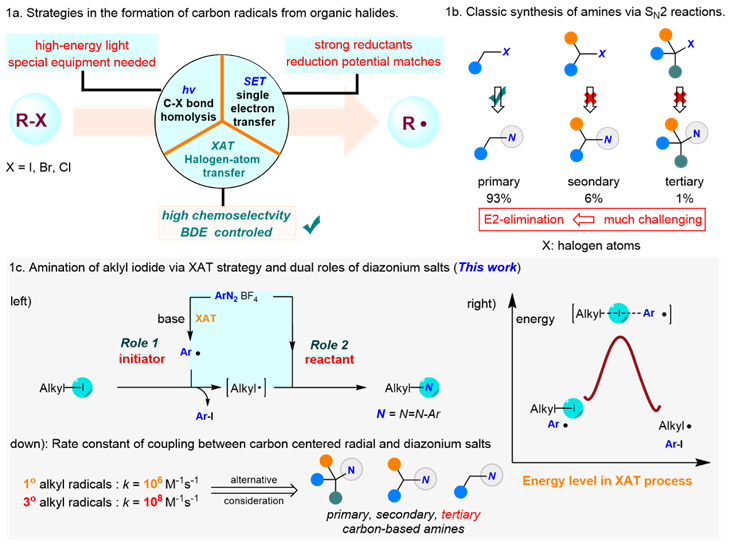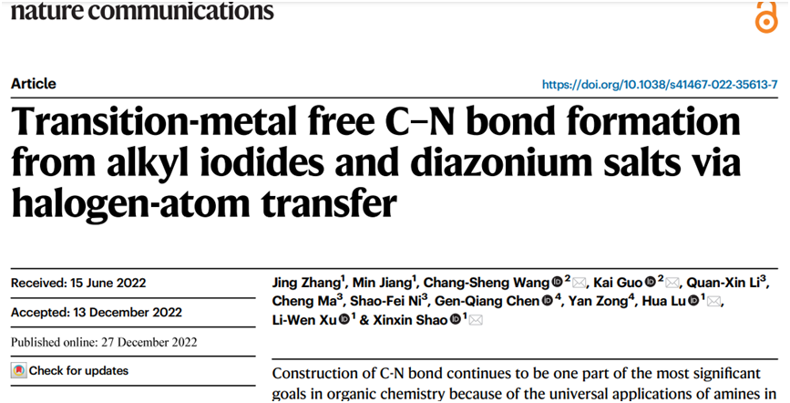 近日, 亚洲色吧 亚洲色吧 特聘研究员邵欣欣、卢华教授在烷基碘化物的自由基胺化研究上取得最新研究进展,相关成果以题为“Transition-metal free C–N bond formation from alkyl iodides and diazonium salts via halogen-atom transfer”发表于Nature Communications(《自然-通讯》)。