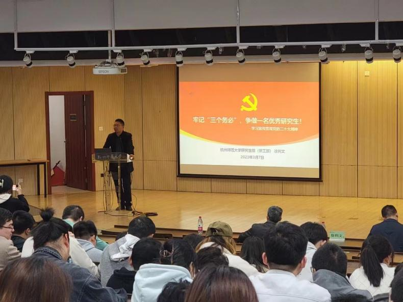 徐利文以《牢记“三个务必”,争做一名优秀研究生》为题为全体研究生做了一场精彩报告,从“国家过去五年的工作和新时代十年的伟大变革、开辟马克思主义中国化时代化新境界、新时代新征程中国共产党的使命任务、加快构建新发展格局着力推动高质量发展、实施科教兴国战略强化现代化建设人才支撑”等方面,结合党史和校史,对党的二十大精神进行了详细解读,并带领同学们学习了习近平总书记对研究生教育工作作出的重要指示、2023政府工作报告和雷锋精神。结合个人成长经历,他从“优秀研究生的基本特质、化学或材料领域研究生的注意事项和心理素质”等方面为如何成为一名优秀研究生指明了成长路径,强调研究生应该具备不畏困难和坚忍不拔的斗争精神,牢记“三个务必”,提高科技创新综合实力,立志做有理想、敢担当、能吃苦、肯奋斗的新时代高层次人才,为实现中华民族伟大复兴贡献自己的青春和智慧。