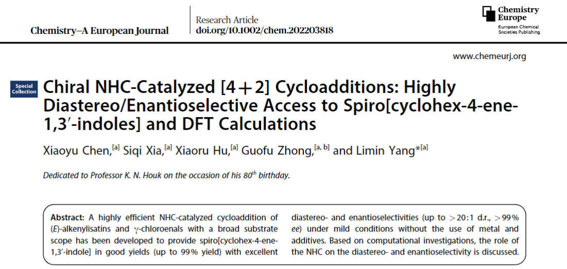 近日,亚洲色吧 杨丽敏副教授课题组在“Chem. Eur. J.”(IF=5.028)期刊发表学术论文“Chiral NHC-Catalyzed [4+2] Cycloadditions: Highly Diastereo/Enantioselective Access to Spiro[cyclohex-4-ene-1,3’-indoles] and DFT Calculations”.