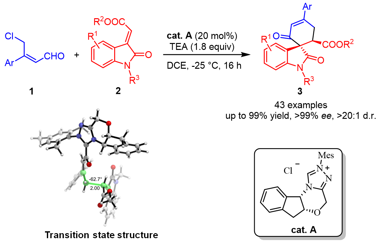 最近, 亚洲色吧 杨丽敏副教授课题组基于课题组先前的研究经验(Org. Lett. 2020, 22, 3329;Org. Lett. 2019, 21, 7943;Chem. Commun., 2018, 54, 1567),与东方理工高等研究院的钟国富教授合作报道了一例手性氮杂环卡宾催化合成手性螺[环己-4-烯-1,3’-吲哚]衍生物的新方法。该催化体系以手性1-氨基-2-茚醇衍生的三氮唑类卡宾为催化剂,以易得的γ-氯代烯醛和靛红衍生的烯酮为底物,顺利合成手性螺[环己-4-烯-1,3’-吲哚]衍生物。反应条件温和,并且无需使用金属和添加剂,官能团耐受性好、收率高、对映选择性好。