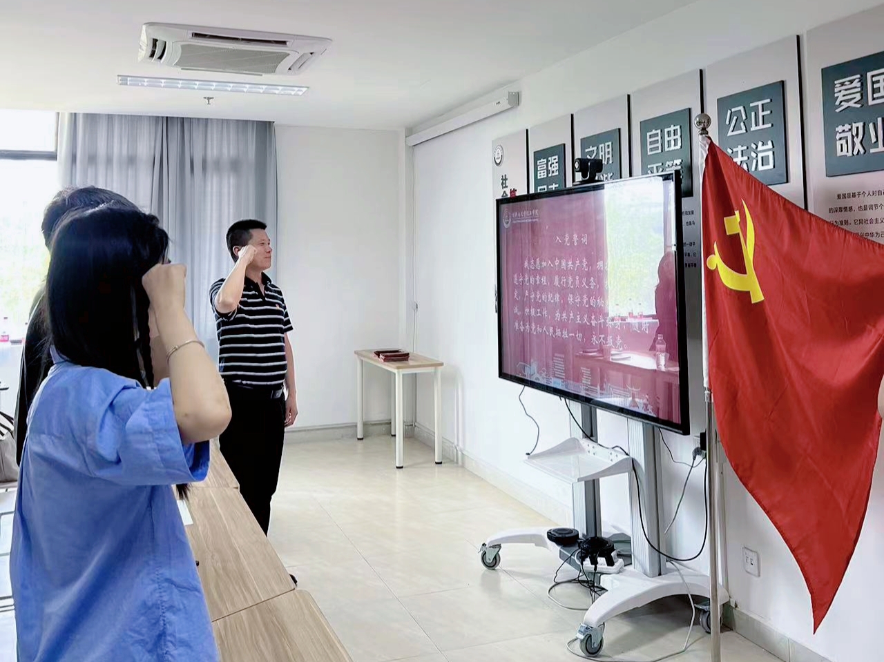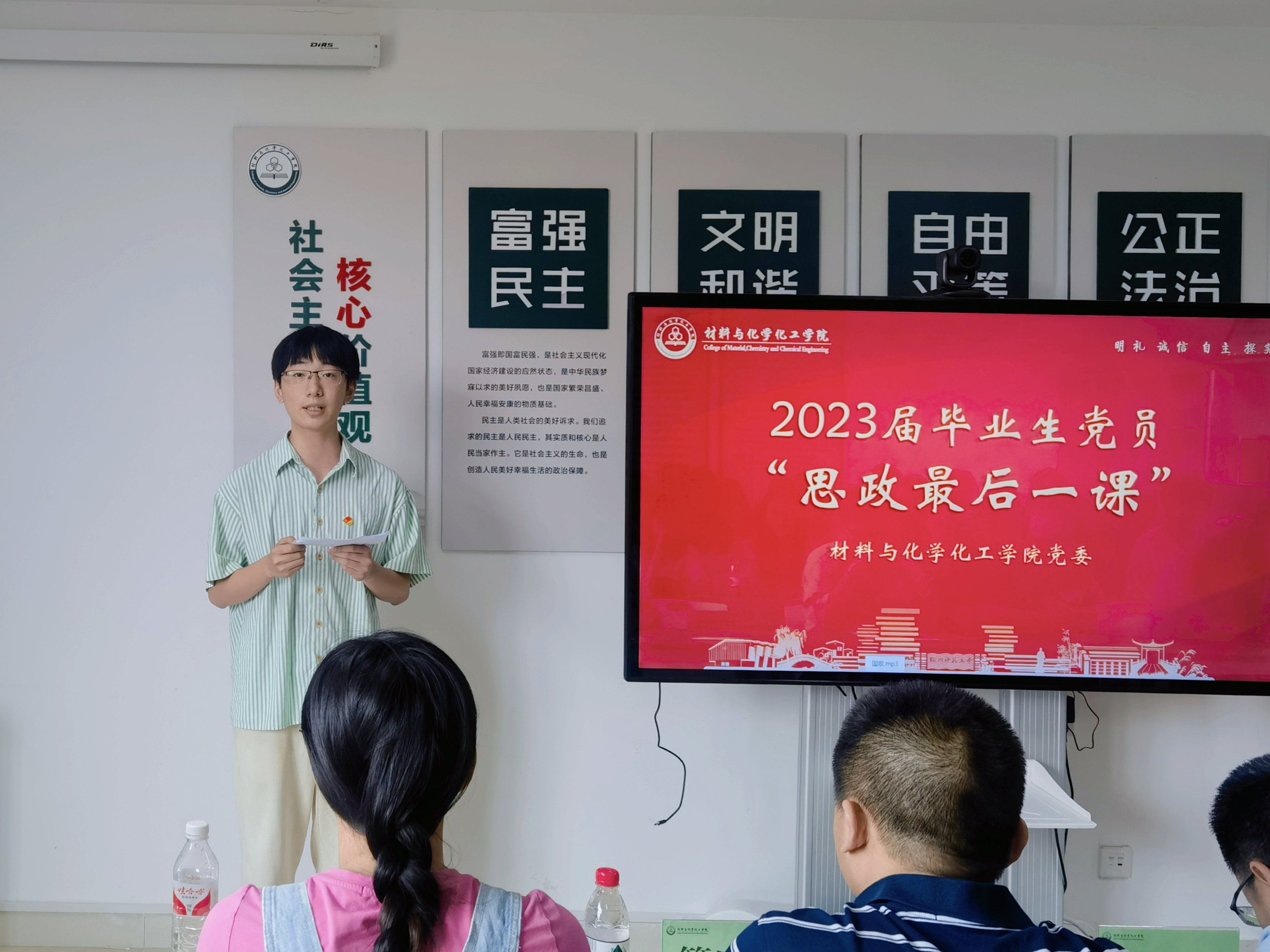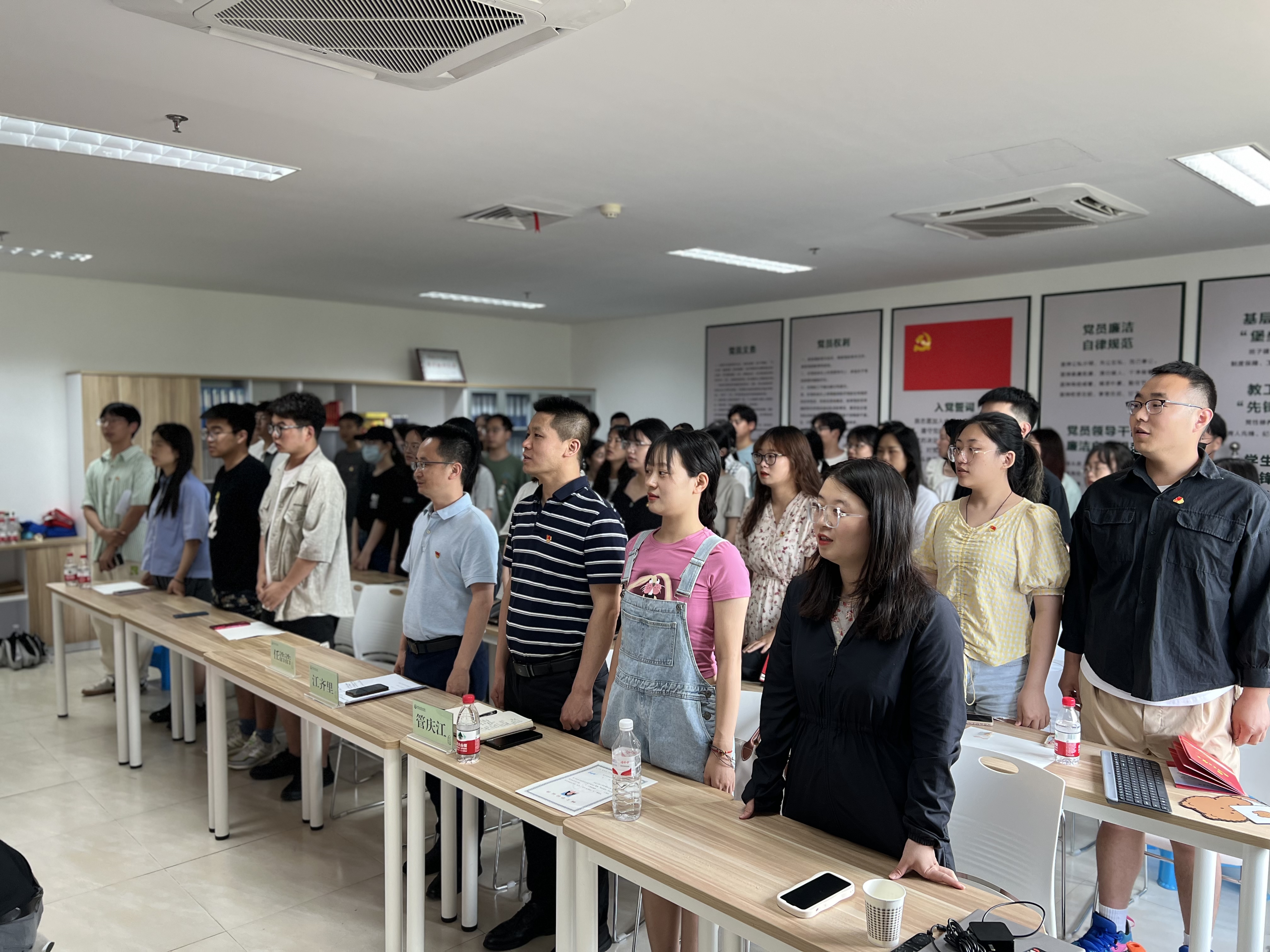 开课伊始,随着国歌的奏响,全体师生党员庄重肃立,眼神坚定,齐唱国歌。