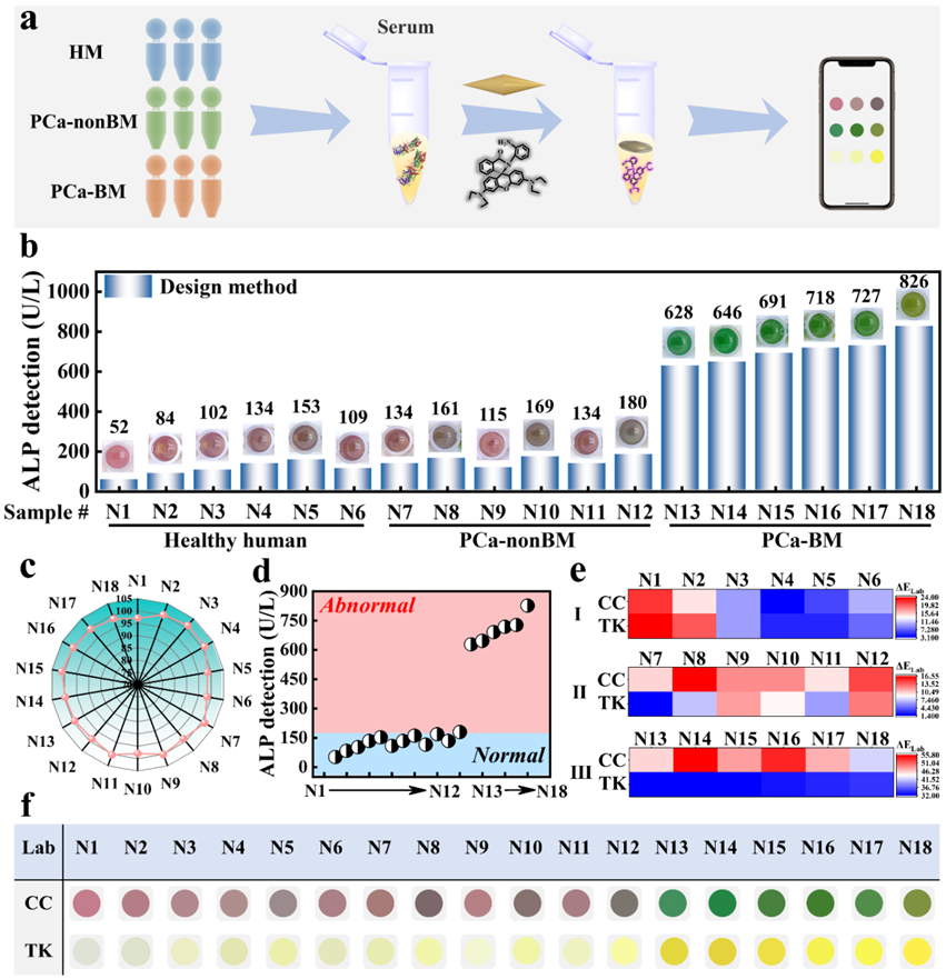 既往研究表明,碱性磷酸酶(ALP)是临床中广泛使用的监测PCa-BM的指标,其作为PCa-BM的生物标志物具有出色的特异性(98%)和敏感性(60%)。骨转移的发生导致大量成骨细胞增殖,引起ALP水平升高。当骨转移发生时,会增加血清中的ALP表达水平。将ALP的异常升高变化与正常水平(40-150 U/L)相比,可用来监测骨转移的发生和发展。然而,目前大多数方法在150 U/L左右的颜色识别直观程度较低,无法在PCa-BM早期诊断中实现关键的颜色区分以判别ALP的异常表达。因此,值得进一步开发更简便、高分辨率的视觉信息处理技术,用于肉眼检测识别异常的ALP浓度,并实现骨转移早期诊断。