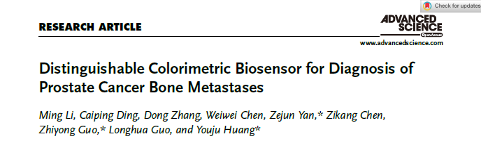 近日,亚洲色吧 黄又举教授团队与宁波大学附属第一医院合作开发用于诊断前列腺癌骨转移的可视化比色生物传感器方面取得新进展。相关研究结果以“Distinguishable Colorimetric Biosensor for Diagnosis of Prostate Cancer Bone Metastases”为题在Advanced Science (Q1, IF=15.1)期刊接收。DOI: 10.1002/advs.202303159。