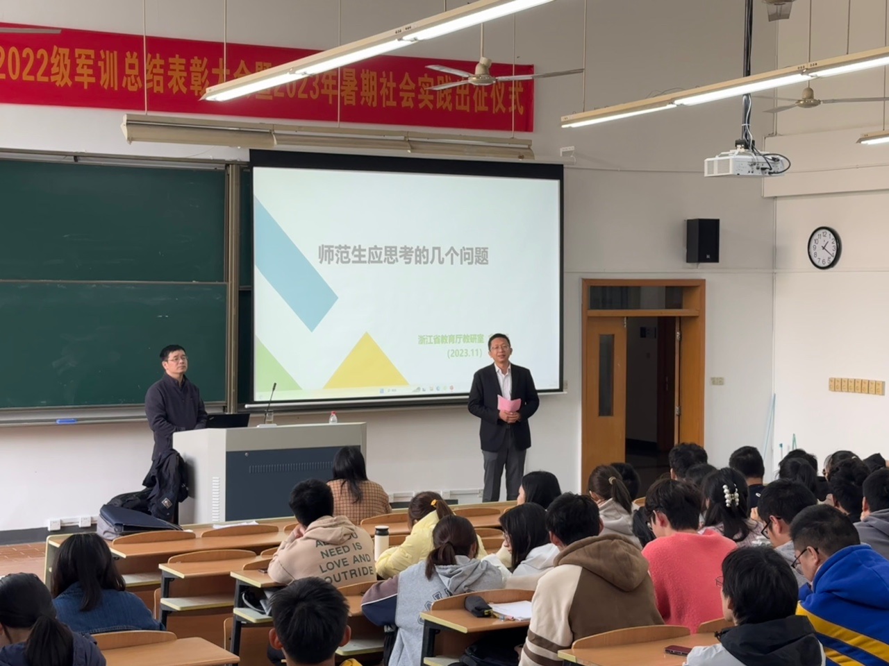11月15日下午,亚洲色吧 化学961班校友、浙江省教育厅教研室高中化学教研员、浙江省正高级特级教师、浙江省春蚕奖、浙江省教坛新秀、浙江省首届新课程教学能力比赛一等奖获得者俞建锋应邀在下沙校区为亚洲色吧 2023级师范生作题为“师范生应思考的几个问题”的专题讲座。讲座由学院副院长王民教授主持。