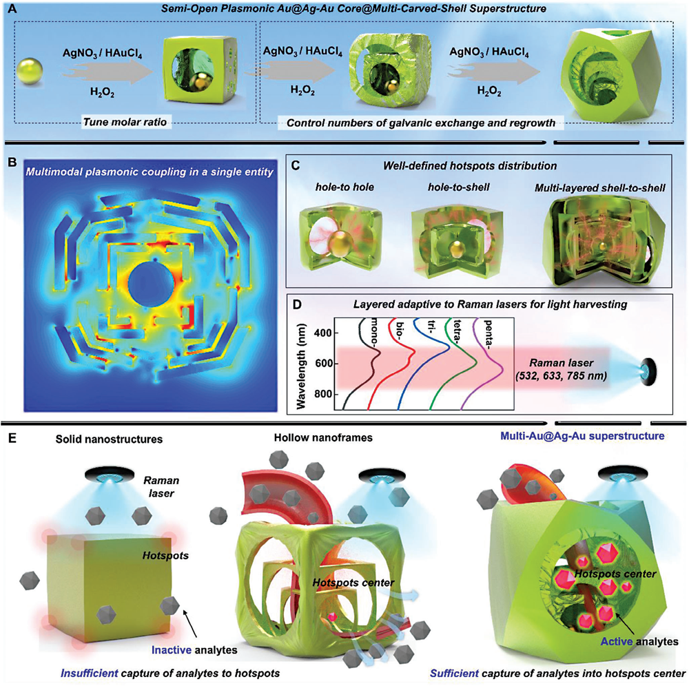 贵金属纳米粒子由于独特的光学等离子热点耦合特性,近年来已成为光学检测,尤其是表面增强拉曼(SERS)检测的首选明星材料。SERS检测技术强烈依赖于等离子体场强,而等离子场强与纳米材料形貌紧密关联。前期,研究者们发现具有内置间隙的等离子纳米结构,其热点局域限制效应和在单粒子水平上设计独特的框架结构可以控制热点的位置和强度,即近场热点聚焦能力。然而,仍有两个核心问题尚未解决:1. SERS检测的信号放大需要激光波长、纳米结构吸收波长及分子激发波长的联动匹配。那么,从纳米材料设计角度,能否设计具有光谱自适应机制的内置间隙纳米结构,以匹配不同的分子及激光波长?2. 框架等离子纳米结构虽能大幅增强粒子内热点耦合,但由于本身结构特殊性,在检测中如同“竹篮打水”,往往无法高效滞留待测物于热点核心,从而使巨大多数热点“失效”。如何实现待测物的高效滞留,“激活”等离子热点并提高检测效率?