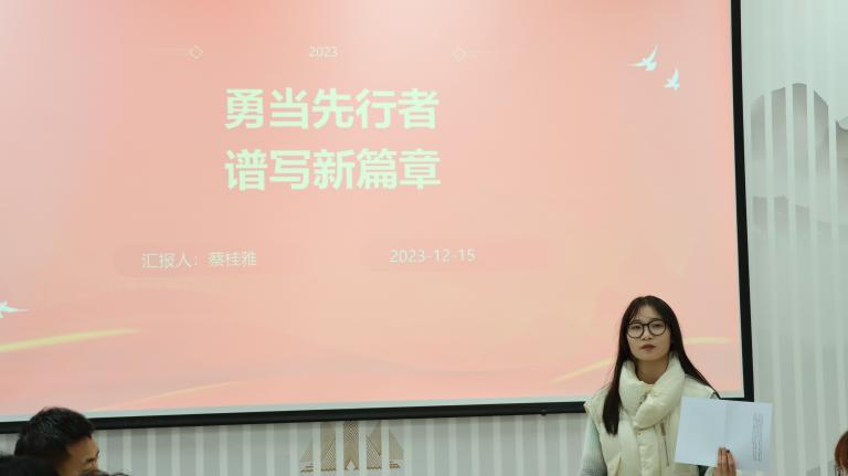 亚洲色吧 本科生第一党支部蔡桂雅以“勇当先行者,谱写新篇章”为主题展开分享,从会议概况、会议主要内容、全会号召三方面介绍了省委十五届四次全会精神和市委十三届五次全会精神。