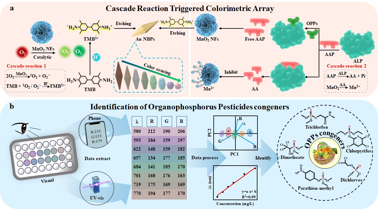 有机磷农药(OPPs)通常用于控制害虫和提高作物生产力。现代农业经常使用轮作和药物轮换来减少长时间种植单一作物时出现的连续种植障碍。然而,这可能导致土壤、水、作物和加工食品中残留的有机磷农药种类和浓度增加,从而导致多而复杂的食品危害。基于有机磷是含有磷原子与氧(通过磷键)或硫(通过硫酰键)双键的化合物。氧原子和硫原子都是活性氢键受体,可以与许多生物酶的活性中心(如乙酰胆碱酯酶的丝氨酸羟基或碱性磷酸酶的Thr413、Gln375、Asp55)形成氢键,从而形成更稳定的磷酸化酶。基于这一原理,酶抑制比色法被用于简单快速地检测OPPs同系物。虽然酶抑制试验比色法的显著优势是催化底物显色具有高特异性,但该显色剂通常是单一颜色深浅的变化,在可视化检测识别方面存在灵敏度和准确性弱的限制。