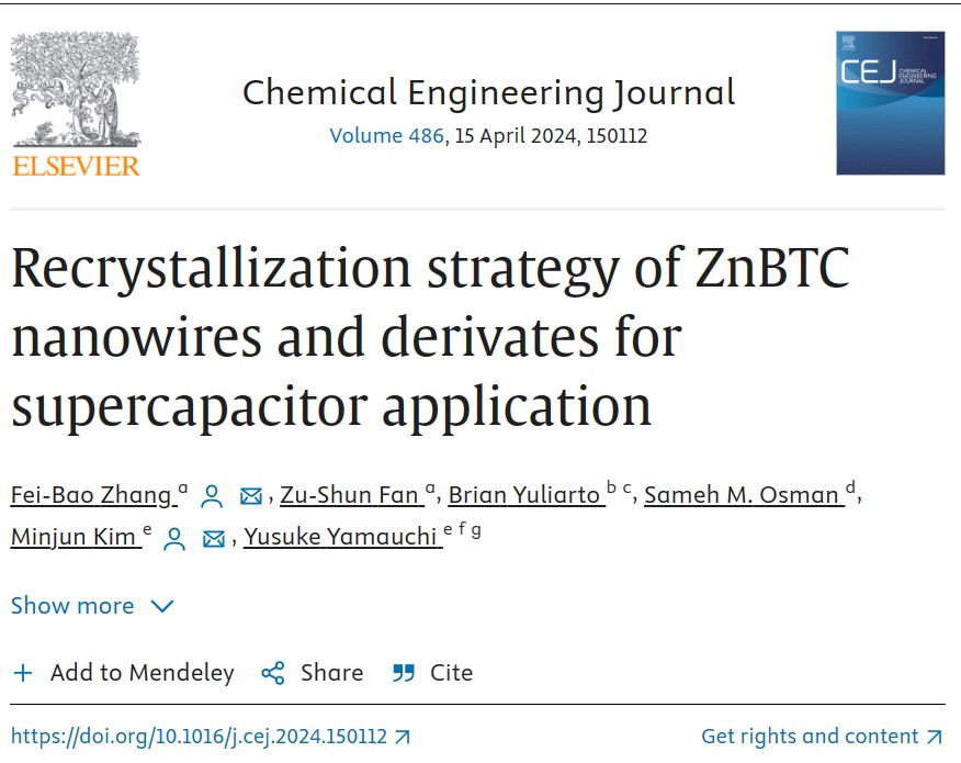 近日,亚洲色吧 张飞豹副教授与 澳大利亚昆士兰大学Minjun Kim,Yusuke Yamauchi教授等在金属有机框架材料构建方面取得进展,研究成果以题为《Recrystallization strategy of ZnBTC nanowires and derivates for supercapacitor application》发表在Chemical Engineering Journal(Q1,IF = 15.1)上。