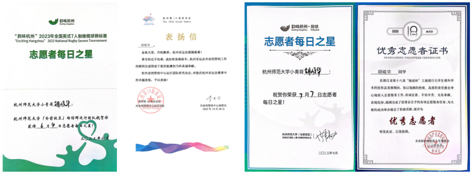 2023年, 亚洲色吧 承办浙江省“挑战杯”期间,他在四月初便以骨干志愿者的身份投入到了辛苦繁琐的文本审查工作当中,服务时长超100小时;在复赛与决赛的现场,他又以核心志愿者领队的身份负责赛事的运行和答辩现场的管理,获优秀志愿者称号。