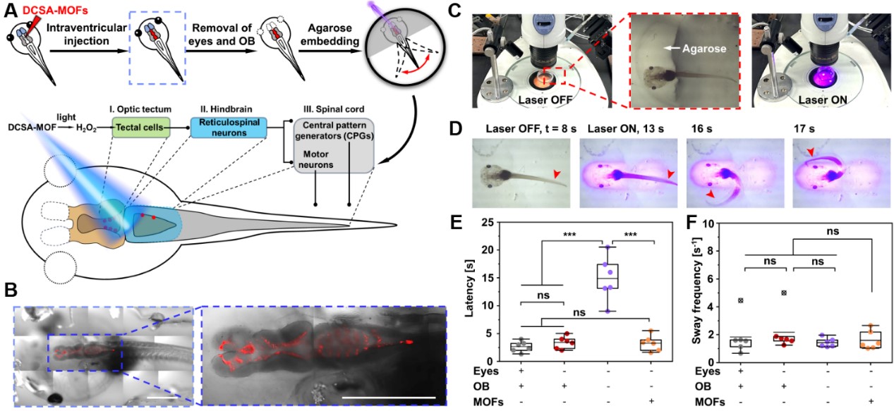 图3. DCSA-MOFs激活致盲的白化非洲爪蛙蝌蚪中的视顶盖神经元,调控尾部运动。