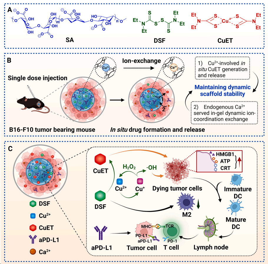 图1. 内源性钙(II)支持的治疗性铜(II)交联凝胶库用于原位DSF激活和增强癌症化学免疫治疗示意图。(A)SA、DSF和CuET的化学结构。(B)aPD-L1/DSF@Cu(II)-SA-Gel与内源性Ca2+离子交换维持支架的动态稳定性和药物缓释示意图。(C)局部CuET产生及药物释放引起癌症化学免疫治疗增强的机理图。
