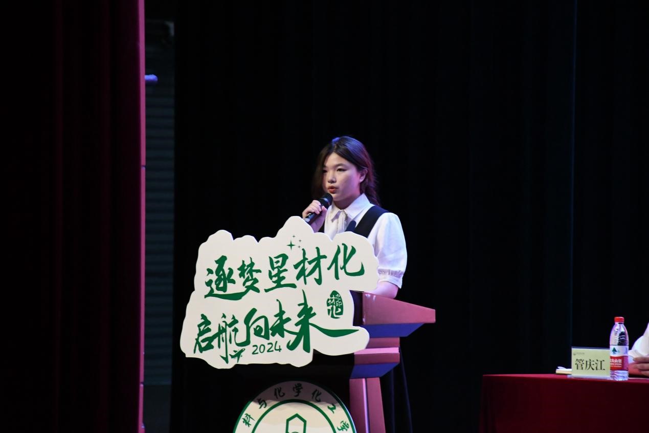 新生代表、化学师范241班的朱桓钰分享三句诗文与大家共勉:一、“莫等闲”,强调自律与珍惜时间;二、“千淘万漉”,鼓励坚持理想与努力不懈;三、“勤慎诚恕,博雅精进”,倡导恪守校训,追求学术与品德并重。