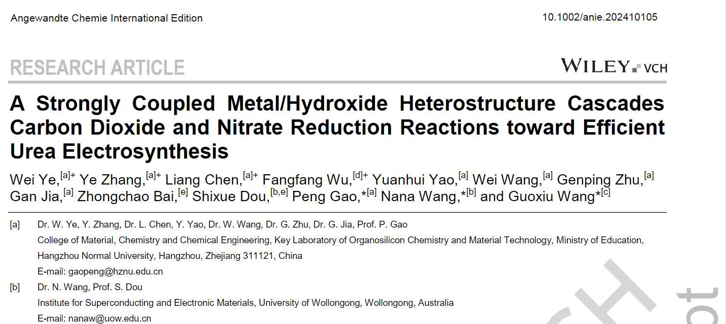 近日,材化学院高鹏教授团队叶伟博士与卧龙岗大学Nana Wang博士和悉尼科技大学Guoxiu Wang教授合作,报道了一种强耦合金属/氢氧化物界面用于串联二氧化碳和硝酸盐还原偶联电合成尿素,相关研究成果以题为“A Strongly Coupled Metal/Hydroxide Heterostructure Cascades Carbon Dioxide and Nitrate Reduction Reactions toward Efficient Urea Electrosynthesis”发表在国际知名期刊Angew. Chem. Int. Ed.(IF = 16.6)上。