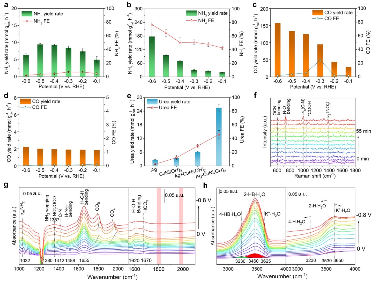 课题组在前期单原子合金实现尿素电合成的动力学调控基础上(Nat. Commun. 2023, 14, 6994),创造性地提出利用强耦合的金属/氢氧化物界面来串联二氧化碳和硝酸盐还原反应,实现高效的C-N偶联电合成尿素。该设计的优势在于金属/氢氧化物界面可以很容易地实现二氧化碳和硝酸盐还原双活性位点的集成。同时,界面处形成的双活性位点可以提供自适应的距离,促进C-N偶联的高效进行。此外,金属和氢氧化物在界面处产生的电子转移,极大地促进了二氧化碳还原反应的速率,界面加速了水裂解供氢过程,促进了尿素形成过程中的脱氧还原步骤。该复合催化剂在-0.5 V的施加电位下(相对于可逆氢电极),尿素的生成活性和法拉第效率分别达到了25.6 mmol gcat.–1 h–1、46.1%,要远优于单一的银金属颗粒和铜掺杂氢氧化镍纳米片结构。进一步引入了原位谱学表征技术和理论计算对反应机理进行了深入研究。