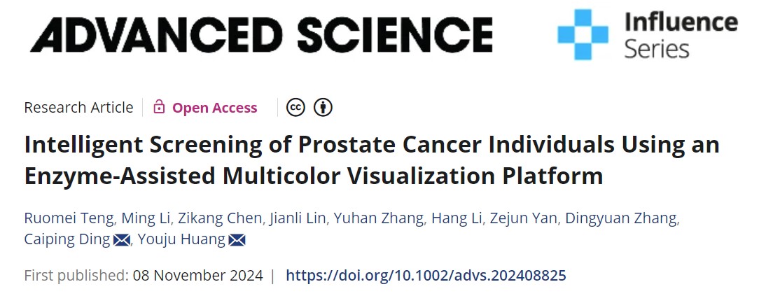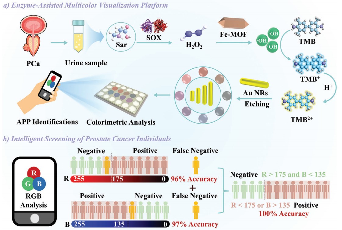 近日,亚洲色吧 黄又举教授团队在利用酶辅助多色可视化平台对前列腺癌患者进行智能筛查方面取得新进展。相关研究结果以“Intelligent Screening of Prostate Cancer Individuals Using an Enzyme-Assisted Multicolor Visualization Platform”为题发表在Advanced Science (Q1, IF=14.3)。DOI: //doi.org/10.1002/advs.202408825。