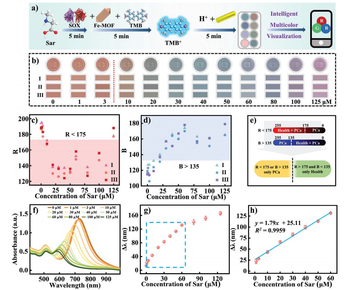 鉴于此,黄又举教授团队设计了一种基于酶辅助多色可视化平台的PCa患者智能筛选方法(图1)。肌氨酸氧化酶(SOX)和Sar之间酶促反应的特异性避免了尿液中结构相似的生物分子的干扰。同时,具有过氧化物酶样活性的Fe-MOF进一步与H2O2反应产生活性氧氧化TMB,最终转化为TMB2+。将Au NRs蚀刻出鲜艳的颜色。通过智能手机拍照可以轻松提取显示颜色的RGB值。当R < 175或B < 135时,可快速(15 min内)、简单直观地诊断出前列腺癌。此外,Au NRs的纵向LSPR峰移与Sar水平呈线性相关,从而可以准确地定量尿液样本中的Sar,如图2所示。该方法为临床前列腺癌早期快速诊断试剂盒的开发提供了理论基础。此外,智能手机技术和图像分析算法的进步可以进一步简化检测过程,增强用户体验,使患者和医疗保健专业人员都可以轻松使用。
