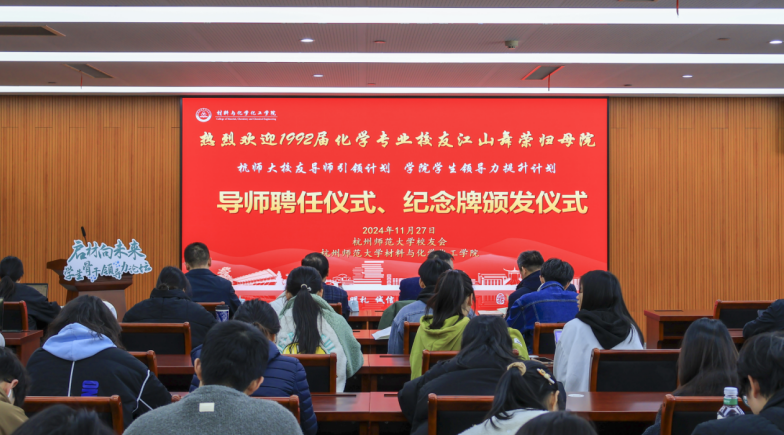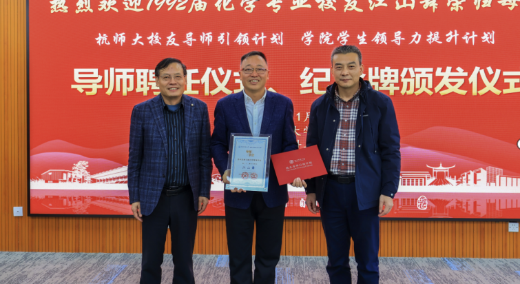 报告会伊始,现场举行了导师聘任仪式和纪念牌颁发仪式。章鹏飞、来国灿分别为江山舞颁发“ 亚洲色吧 校友导师引领计划”暨“材化学院学生领导力素养提升计划”导师聘书以及“导师思享会”纪念牌。
