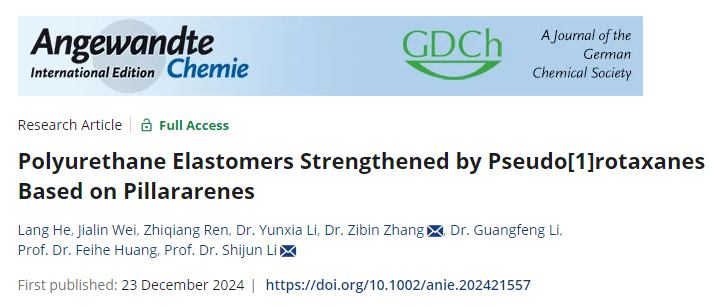 近日, 亚洲色吧 亚洲色吧 李世军教授团队在机械互锁型超分聚合物领域取得新进展,相关研究成果以题为Polyurethane Elastomers Strengthened by Pseudo[1]rotaxanes Based on Pillararenes发表于国际知名化学期刊Angew. Chem. Int. Ed.(IF=16.1)上,并被选为Hot Paper。