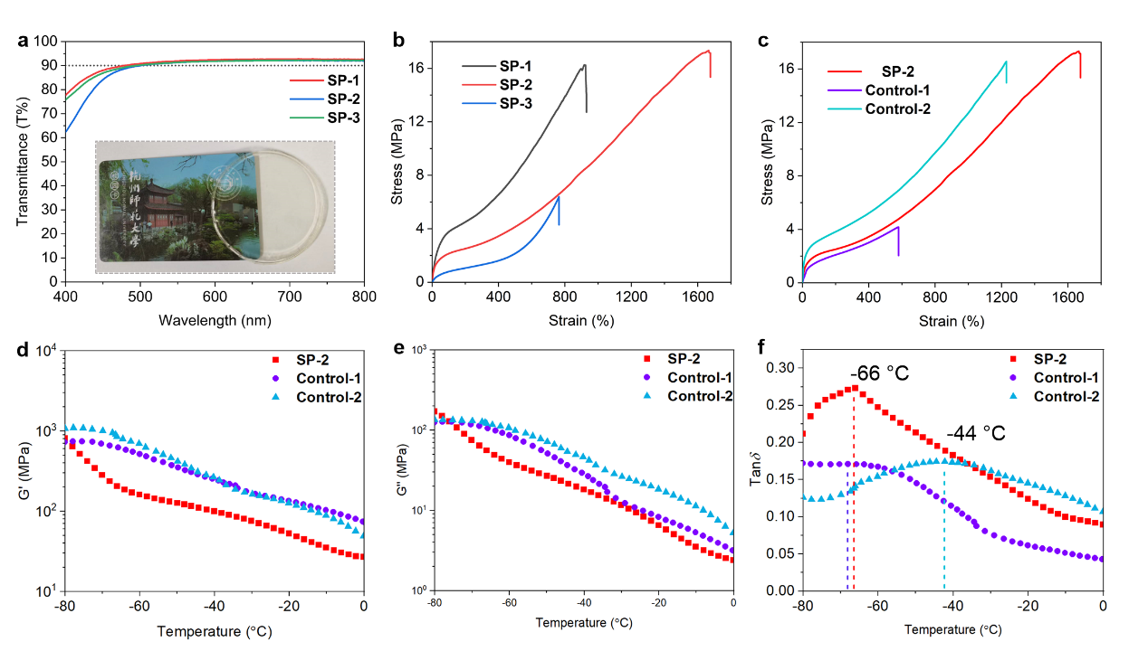 研究表明,含准[1]轮烷的聚氨酯弹性体具有良好的可见光透过率(图3a)。准[1]轮烷的引入赋予了聚氨酯主链特殊的类环状自互锁拓扑结构,明显增强了弹性体的力学性能(图3b-f)。