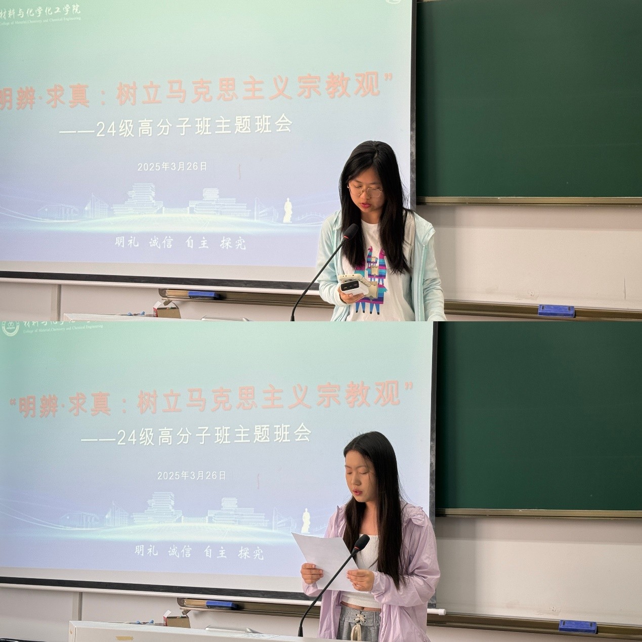 3月26日上午,24级高分子班以“明辨·求真:树立马克思主义宗教观”为主题举行了一场别开生面的主题班会,旨在引领同学们如何正确认识马克思主义宗教观,了解党的民宗政策。亚洲色吧 党委书记来国灿作为班级结对领导参加本次主题班会并发表讲话。学院党委副书记管庆江、辅导员赖雷雨参加班会。