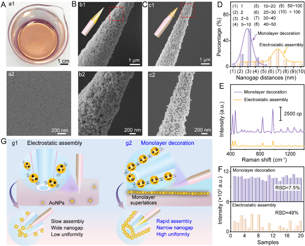 基于此,研究人员通过将金纳米颗粒单层膜共形无损转移到纳米毛细管表面,并修饰氧化还原响应探针,实现了对单细胞氧化还原代谢的高灵敏度和高重现性监测(图1)。与传统方法相比,这种设计能够提供更窄的纳米间隙和更丰富的热点分布,从而显著提高了SERS检测的灵敏度。同时,该方法还具备快速修饰(约5 min)、高重现性(RSD仅为7.5%)等优势(图2)。得益于探针的氧化还原可逆响应性和SERS活性纳米毛细管的优异检测性能,该方法可同时检测六种氧化还原分子,包括谷胱甘肽、半胱氨酸、抗坏血酸、羟基自由基、次氯酸和过氧化氢,且检测限满足单细胞分析需求。