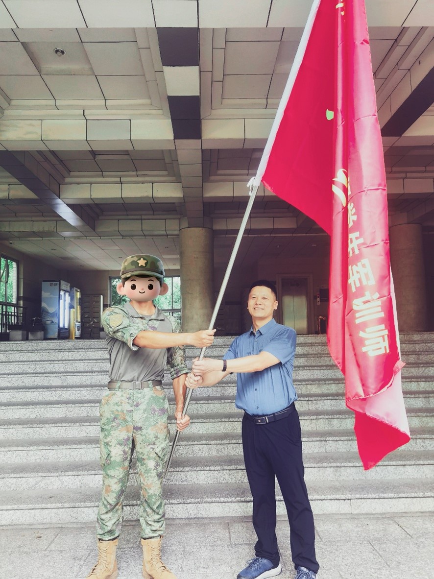 管庆江双手高擎鲜红的连旗,郑重地将其交予教官手中。那一刻,鲜红的旗帜在风中烈烈展开,猎猎作响,它不仅标志着军训任务的正式开启,更承载着学院对2025级新生满满的殷切期望。
