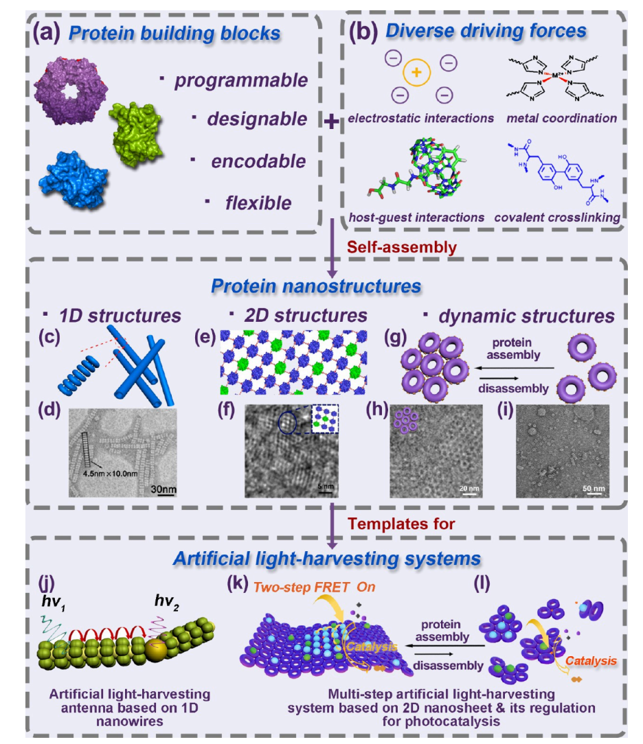 图1. 基于蛋白质组装的人工光捕获设计策略。