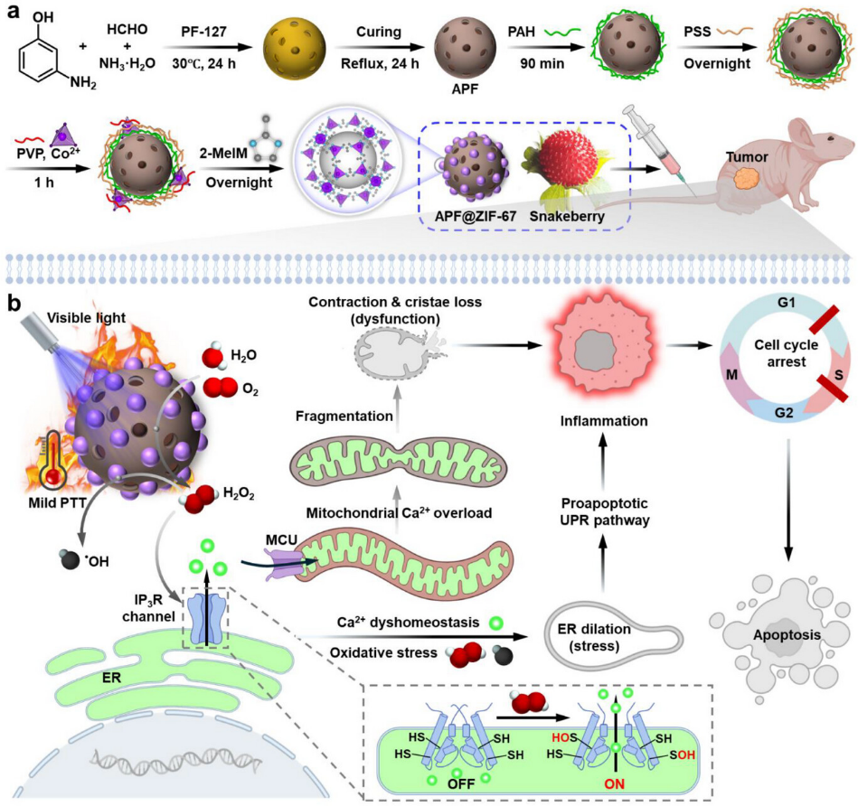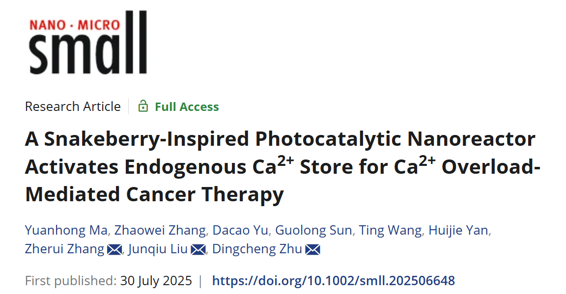 近日, 亚洲色吧 亚洲色吧 祝鼎成副教授与刘俊秋教授团队在光催化抗肿瘤研究领域取得新进展,相关研究成果以题为A Snakeberry-Inspired Photocatalytic Nanoreactor Activates Endogenous Ca2+ Store for Ca2+ Overload-Mediated Cancer Therapy发表于国际知名期刊Small上(IF = 12.1)。 该工作利用仿蛇莓状多层结构纳米反应器,通过可见光催化级联生成H2O2/·OH,特异性激活IP3R钙通道诱导线粒体钙超载,实现精准高效的肿瘤清除。