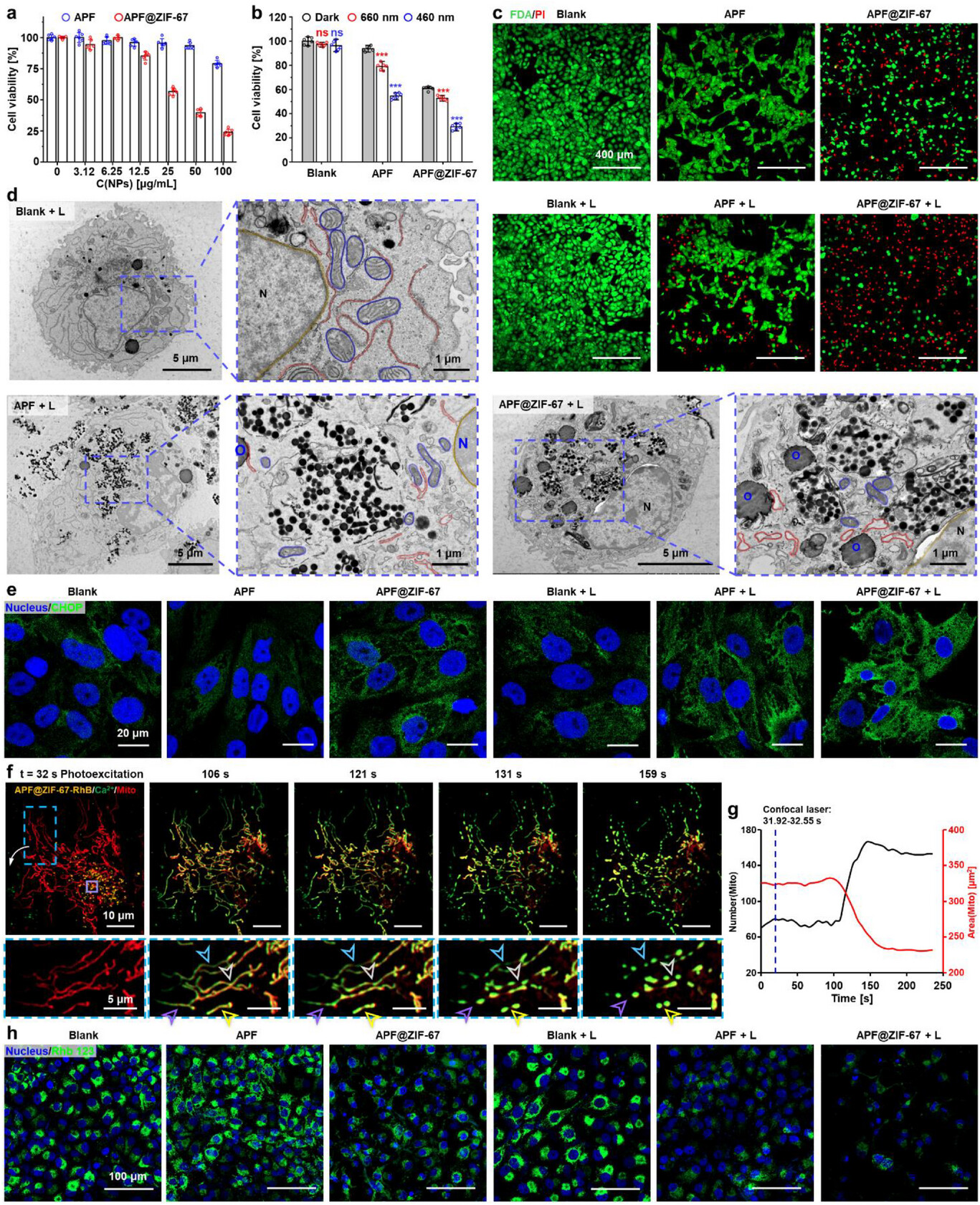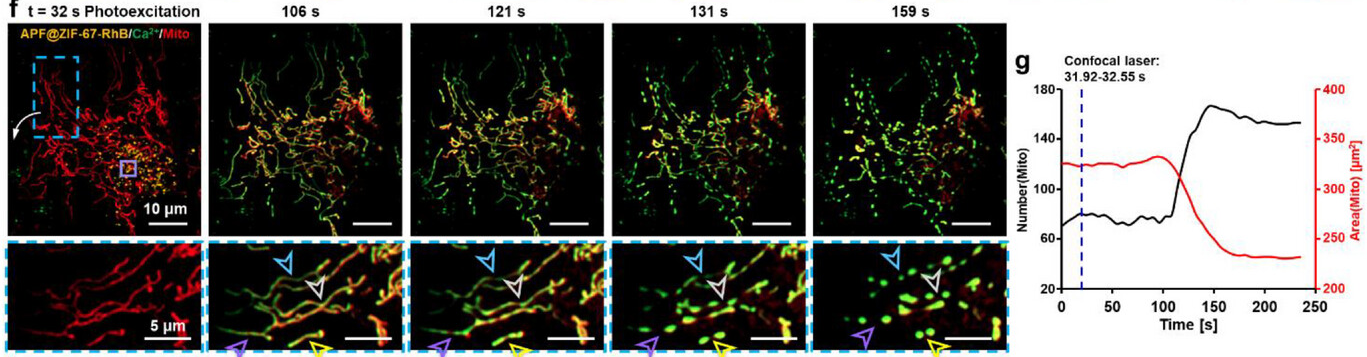 光激活后的 Ca2+会迅速富集在线粒体上,线粒体Ca2+过载后即会发生断裂,由连续管状网络转变为离散颗粒状结构(箭头可以看出)。为准确评估线粒体的损伤程度,线粒体的数量与面积进行了量化分析,可以看出线粒体断裂后线粒体增加并面积减少。(图2)